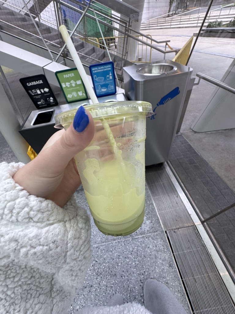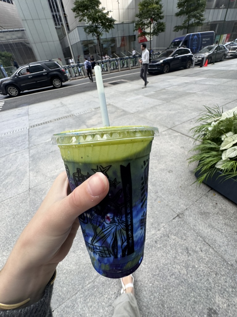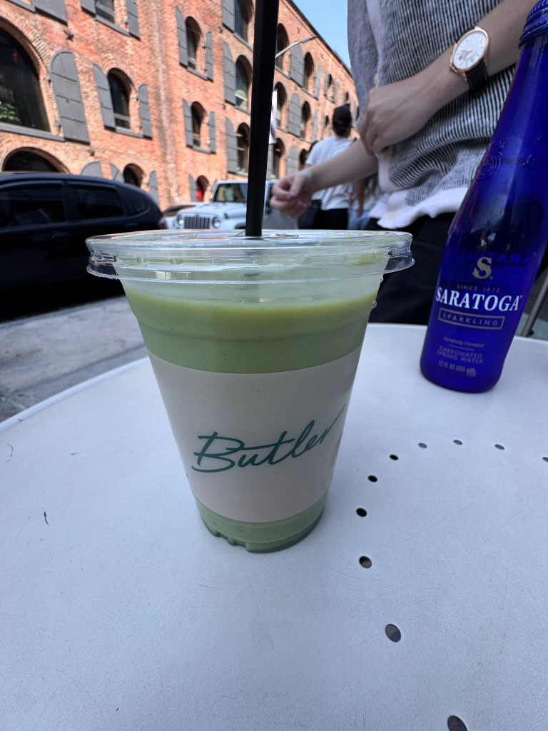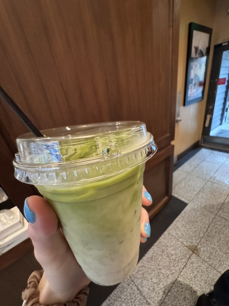 This was my first time having matcha in a smoothie. It has almond milk, matcha, spinach, banana, dates, vanilla, blue spirulina, plant protein, and probiotic coconut yogurt. I was hungry before work and got the smoothie with the most calories and it happened to include matcha. It pleasantly surprised me and wasn’t too sweet, I would recommend except points off because it was $15 and society cannot justify a $15 beverage.