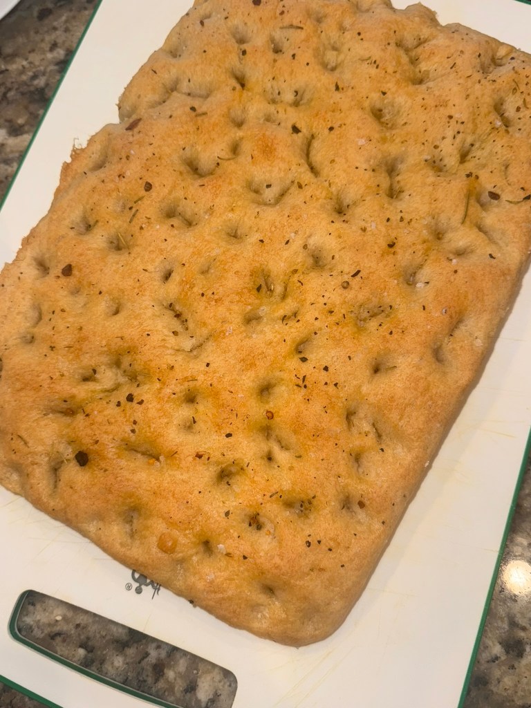 Made this focaccia! It was a little chewy, I want to get better at it.