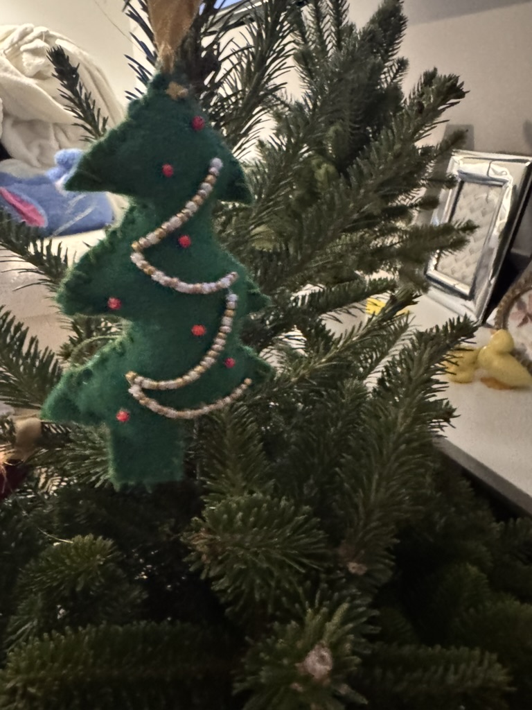 I made this ornament out of felt, stuffing, and beads!